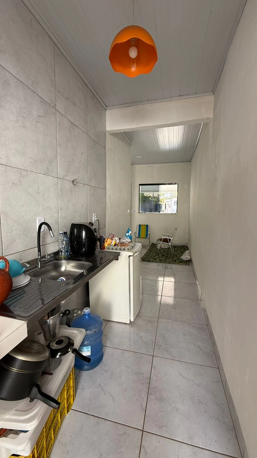 Garagem, sala de estar, cozinha, 2 quartos, sendo 1 suíte, banheiro social e lavanderia